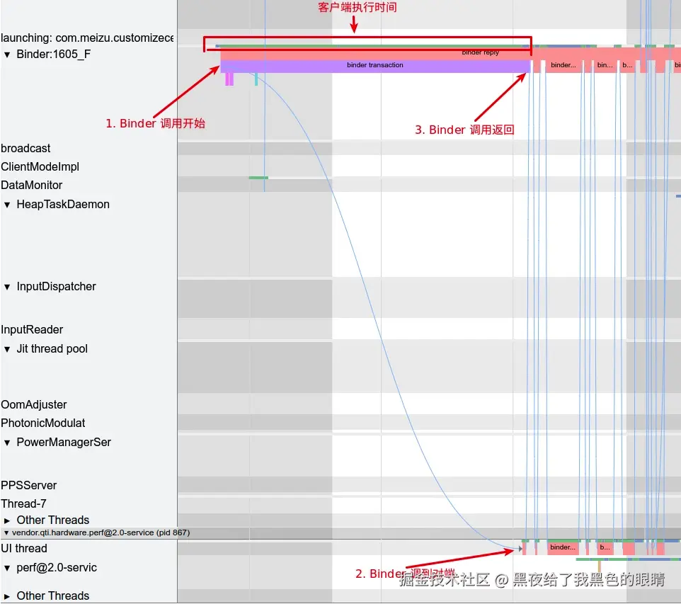图中主要是 SystemServer 进程和 高通的 perf 进程通信,Systrace 中右上角 ViewOption 里面勾选 Flow Events 就可以看到 Binder 的信息