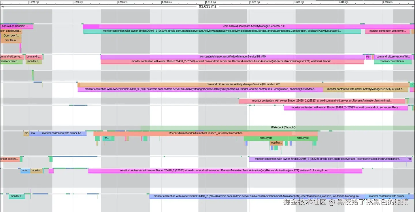 「之所以要单独讲 Systrace 中的 Binder 和锁,是因为很多卡顿问题和响应速度的问题,是因为跨进程 binder 通信的时候,锁竞争导致 binder 通信事件变长,影响了调用端。最常见的就是应用渲染线程 dequeueBuffer 的时候 SurfaceFlinger 主线程阻塞导致 dequeueBuffer 耗时,从而导致应用渲染出现卡顿; 或者 SystemServer 中的 AMS 或者 WMS 持锁方法等待太多, 导致应用调用的时候等待时间比较长导致主线程卡顿」
