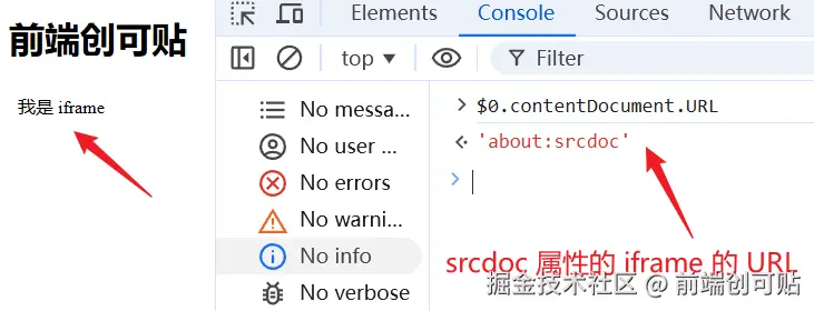 赋值 srcdoc 属性,会生成一个特殊的文档,URL 为 about:srcdoc。