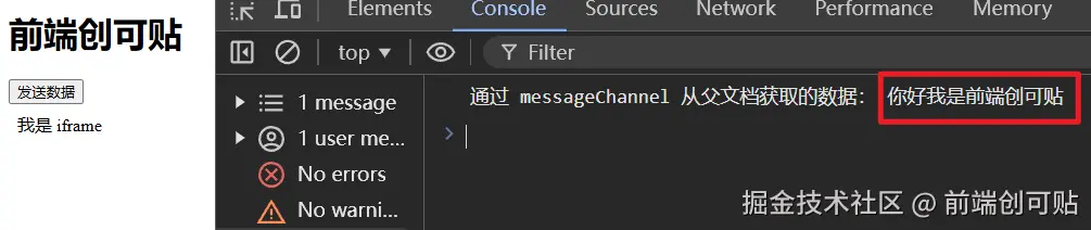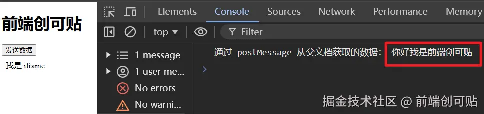 iframe.contentWindow.postMessage("你好我是前端创可贴", "*");