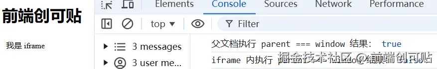 <script>console.log('iframe 内执行 parent === window 结果:', parent === window)</script>