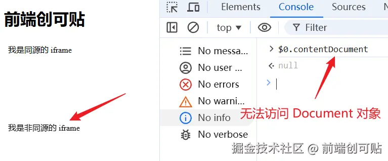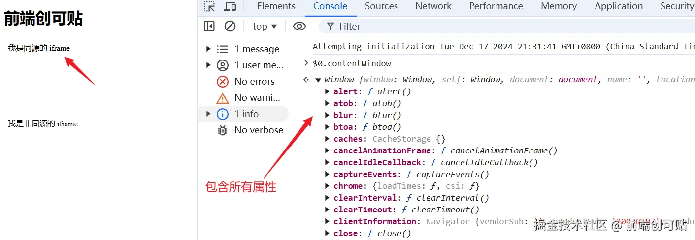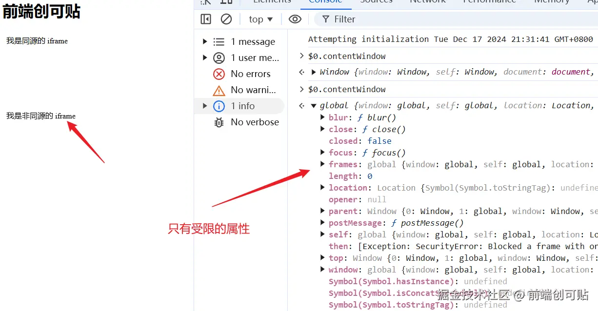 - 如果是跨域的,则返回的 Window 对象功能是受限的,很多属性以及访问 DOM 权限都是没有的。