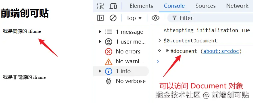 - 如果子文档与父文档是同源的,则该属性返回代表 iframe 元素的 Document 对象。