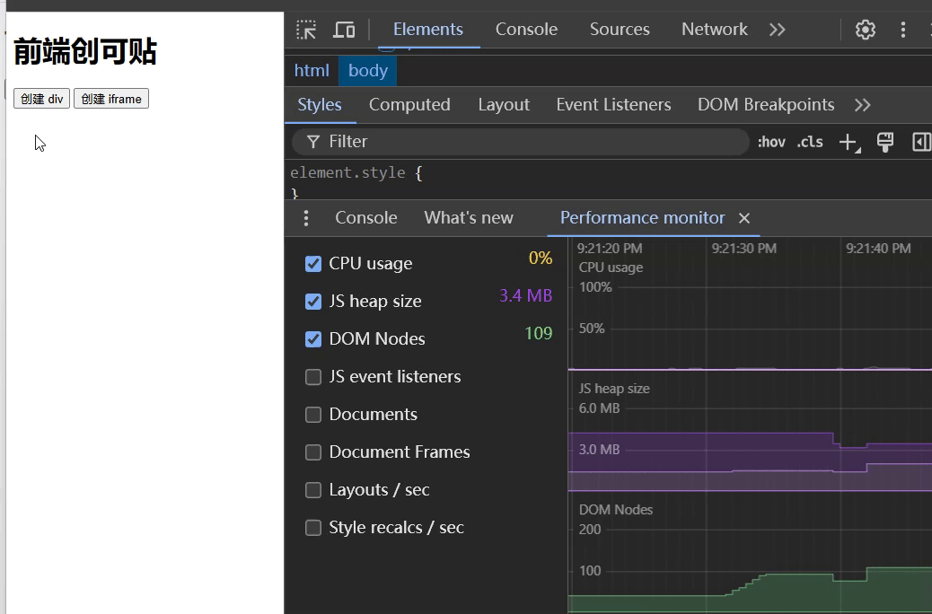 我们来验证一下,我们页面放两个按钮,一个按钮点击后新增一个 iframe 元素,另外一个按钮新增 div 元素: