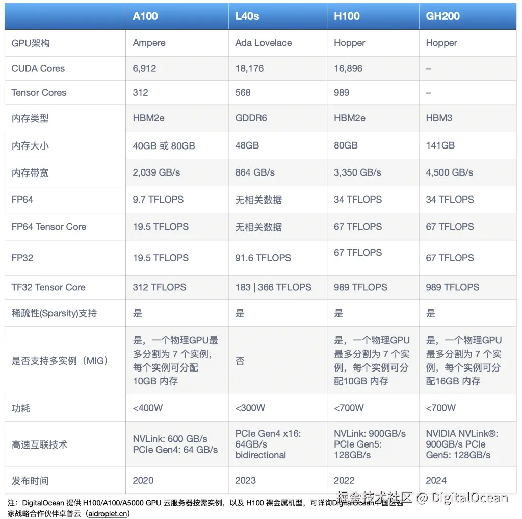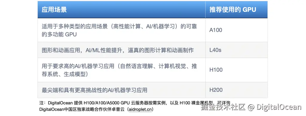 目前,H200 GPU目前还处于量产中,所以预计在明年大家会看到H200的GPU云服务器。大多数的云平台都可提供A100/L40s/H100,例如DigitalOcean的GPU Droplet就提供H100/A100等GPU服务器,其中H100 GPU还提供单一用户专享的裸金属实例,而且价格优惠。如果你希望了解关于H100 GPU Droplet的详细价格折扣与配置,可联系DigitalOcean中国区独家战略合作伙伴卓普云。