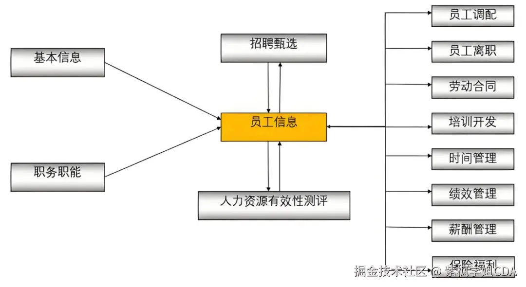 人力资源系统中也会包含着一系列业务数据,如员工、供应商、合作伙伴、原材料、时间、地理位置、业务流程……类别多种多样。