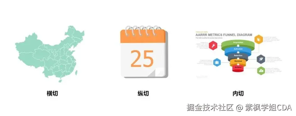 - 内切:根据某个模型从目标内部进行划分。比如如果我们将招聘流程视作“获客-转化”的过程,就可以使用近似使用“AARRR海盗模型”对候选人群体进行漏斗分析