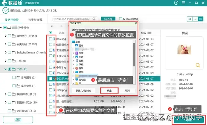 步骤2:在扫描结束后,用户可以在指定位置上选择自己需要恢复的文件;选择完毕后点击“导出” ,然后再选择好恢复文件的存放位置即可。