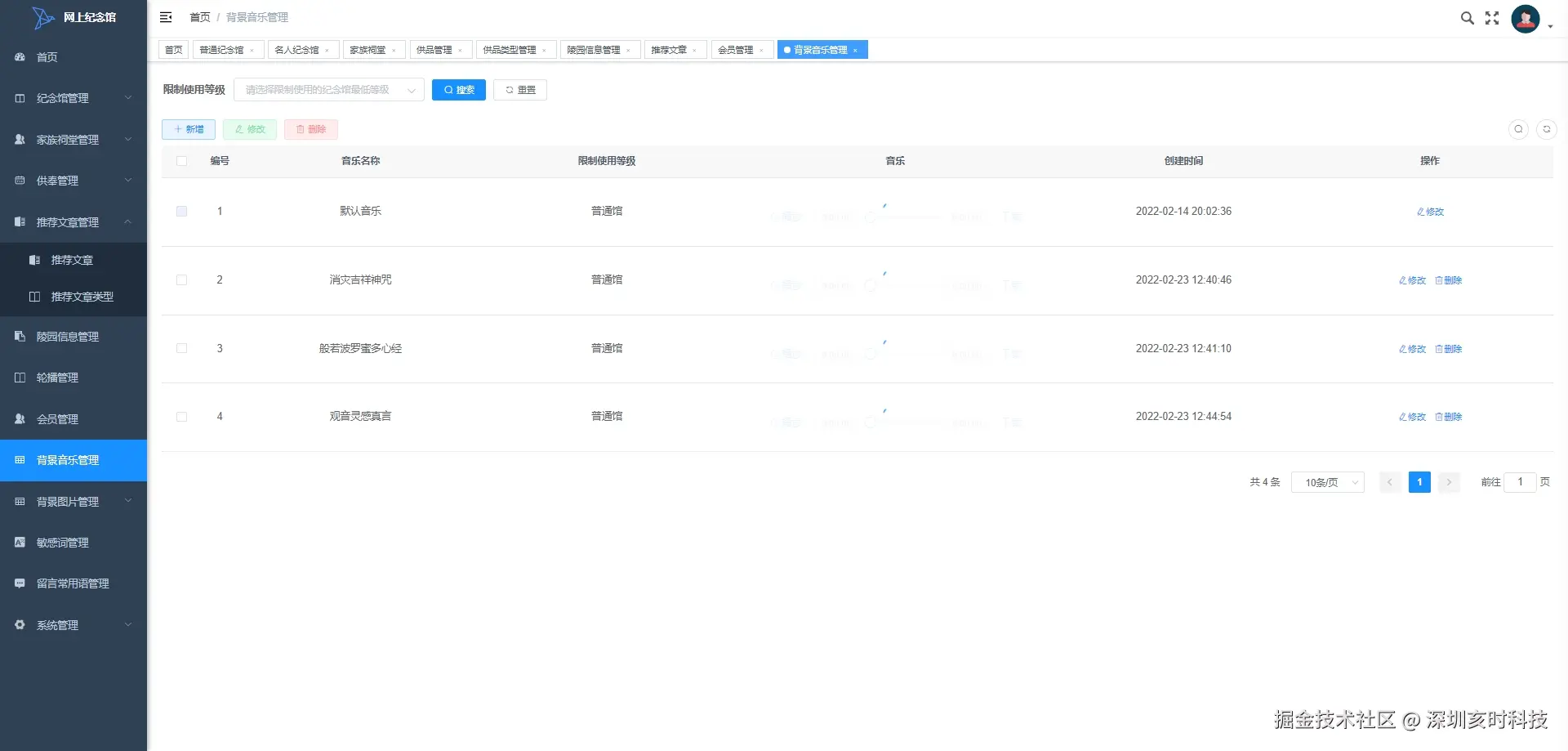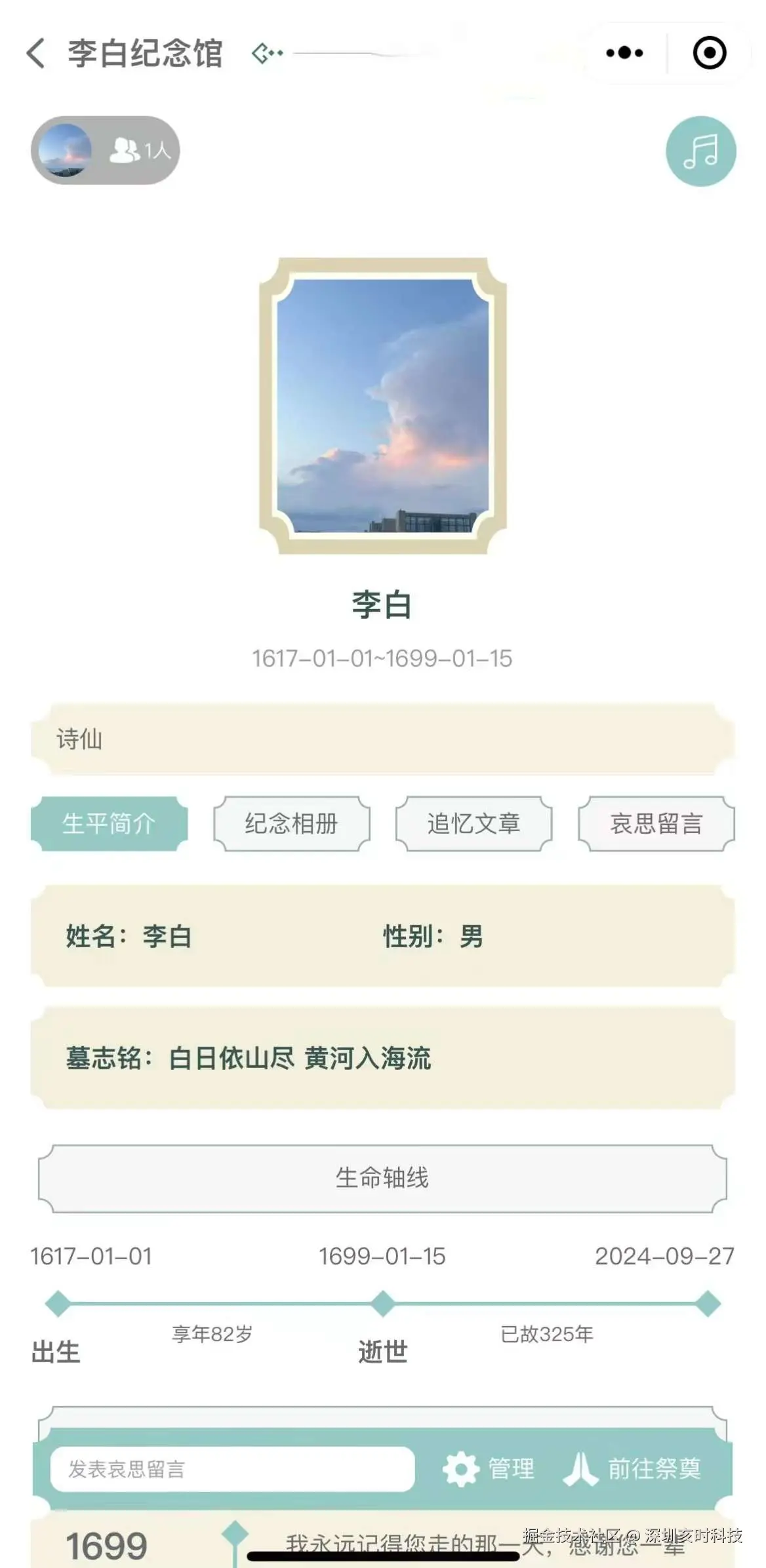 在线纪念平台是一个数字化平台,旨在为用户提供便捷的纪念场馆信息查询、纪念活动参与、纪念文章阅读等服务。系统通过管理端和小程序端,实现了对纪念场馆、家族祠堂、供奉管理、文章推荐、日志管理等功能的全面管理。