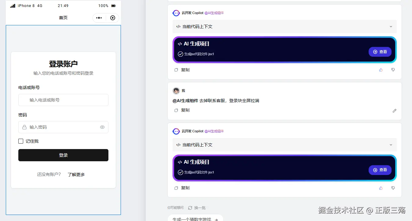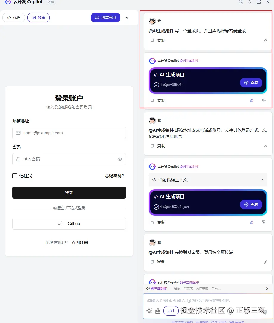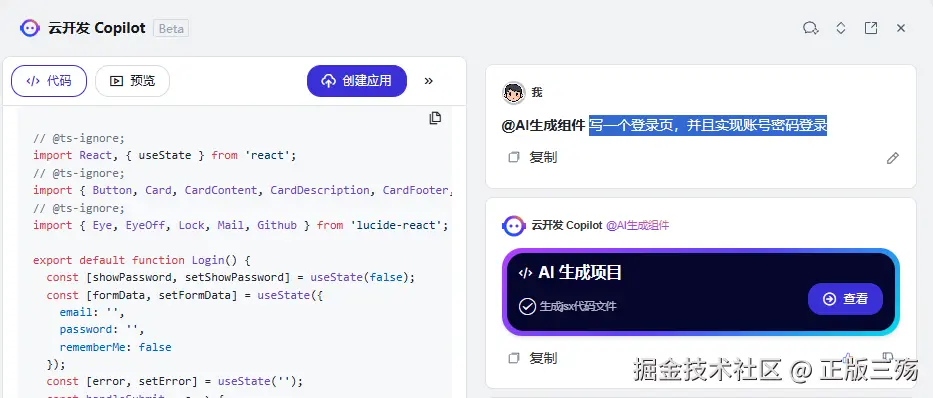 首先我告诉Copilot,帮我实现写一个登录页,并且实现账号密码登录稍等一会就会生成代码。
