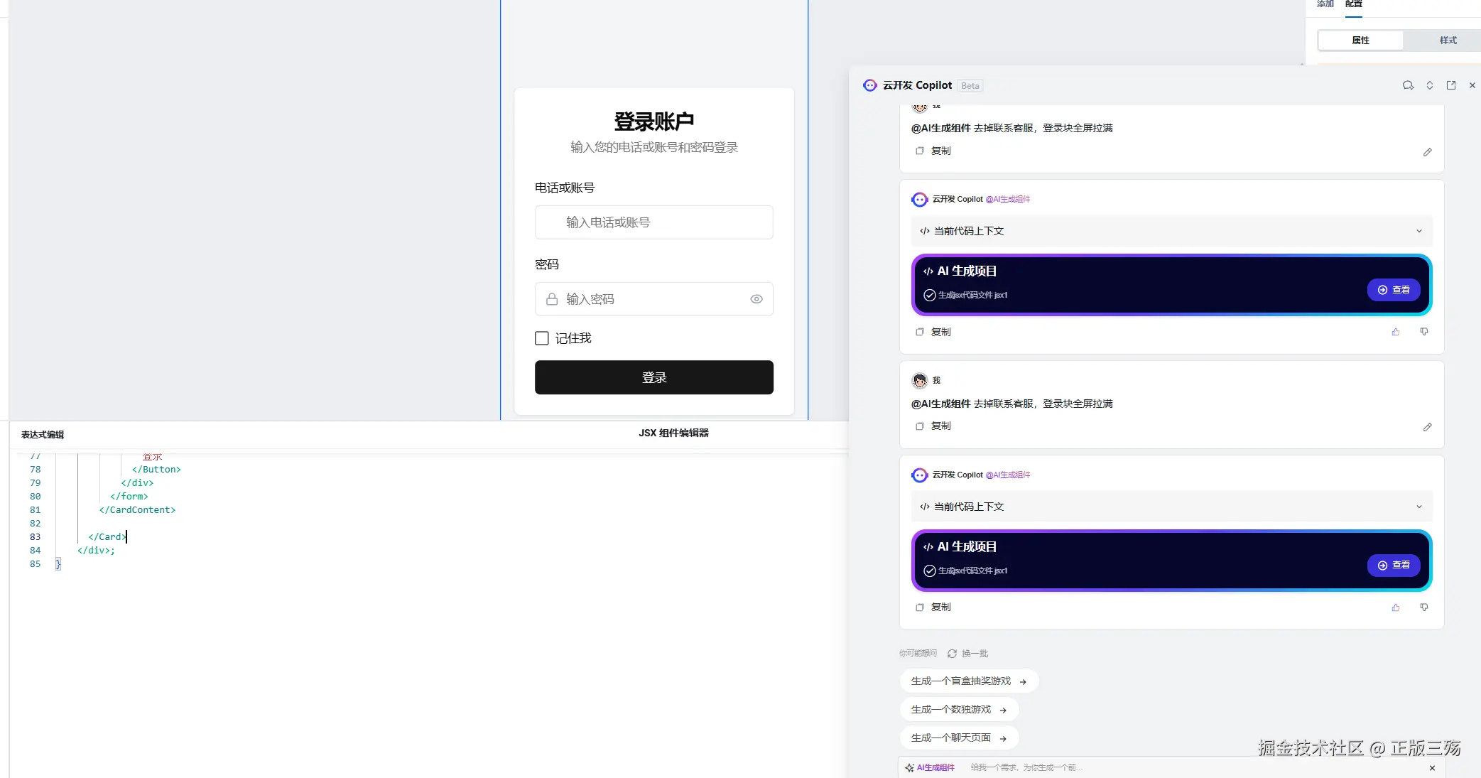 但是结合我的个人需求来说,我并不需要用邮箱登录和Github的方式,也不需要忘记密码和注册账号,,于是我向Copilot提出邮箱地址改成电话或账号,去掉其他登录方式、忘记密码和注册账号,这时候Copilot就帮我把页面更改成这样。