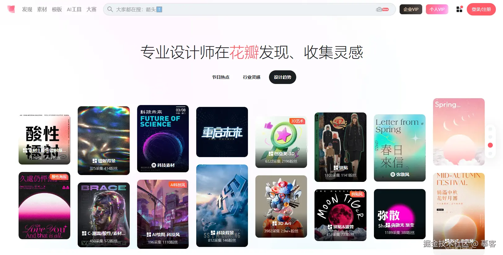 花瓣网是国内知名的创意设计平台,用户可以利用它的采集工具,轻松收集网络上的图片和灵感。与Pinterest不同的是,花瓣网有很多本土化内容,许多国内设计师的作品和灵感都可以在这里找到。此外,它还拥有超过1亿的高质量素材,并提供海报、背景图、矢量图、字体、插画漫画等多种素材模板,好满足设计师的多样化需求。