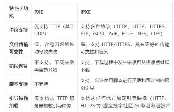 在PXE引导时,服务器会连接到TFTP服务器,通过下载并执行启动文件来完成引导。TFTP是一个基于UDP的简单文件传输协议,下载容易因文件大小和网络波动导致加载引导文件失败。iPXE是PXE的一个开源实现,它提供了比原生PXE更多的特性。以下是PXE和iPXE的对比: