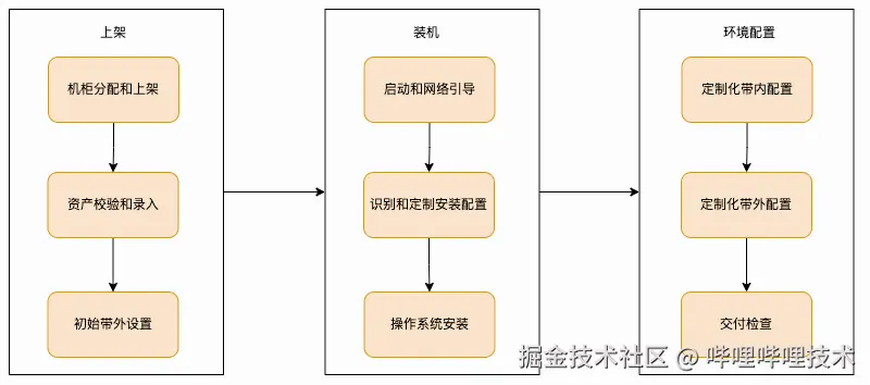 在新交付装机的场景下,整个流程大体分为三个步骤:上架,装机,环境配置(如下图)。