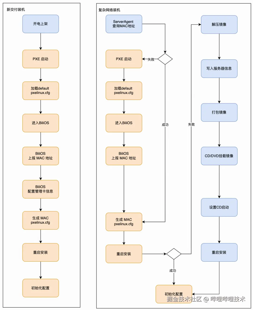 随着B站用户数量的迅速增长和业务的不断扩展,数据中心的规模和复杂性也在不断增加。为了满足新服务器上架交付、系统安装和服务器初始化配置等新交付装机需求,早期采用了传统的PXE装机方案。然而随着IDC和边缘服务器的规模持续增长,以及业务场景的多样化,传统的装机方案逐渐暴露出灵活性不足和效率低下的问题。