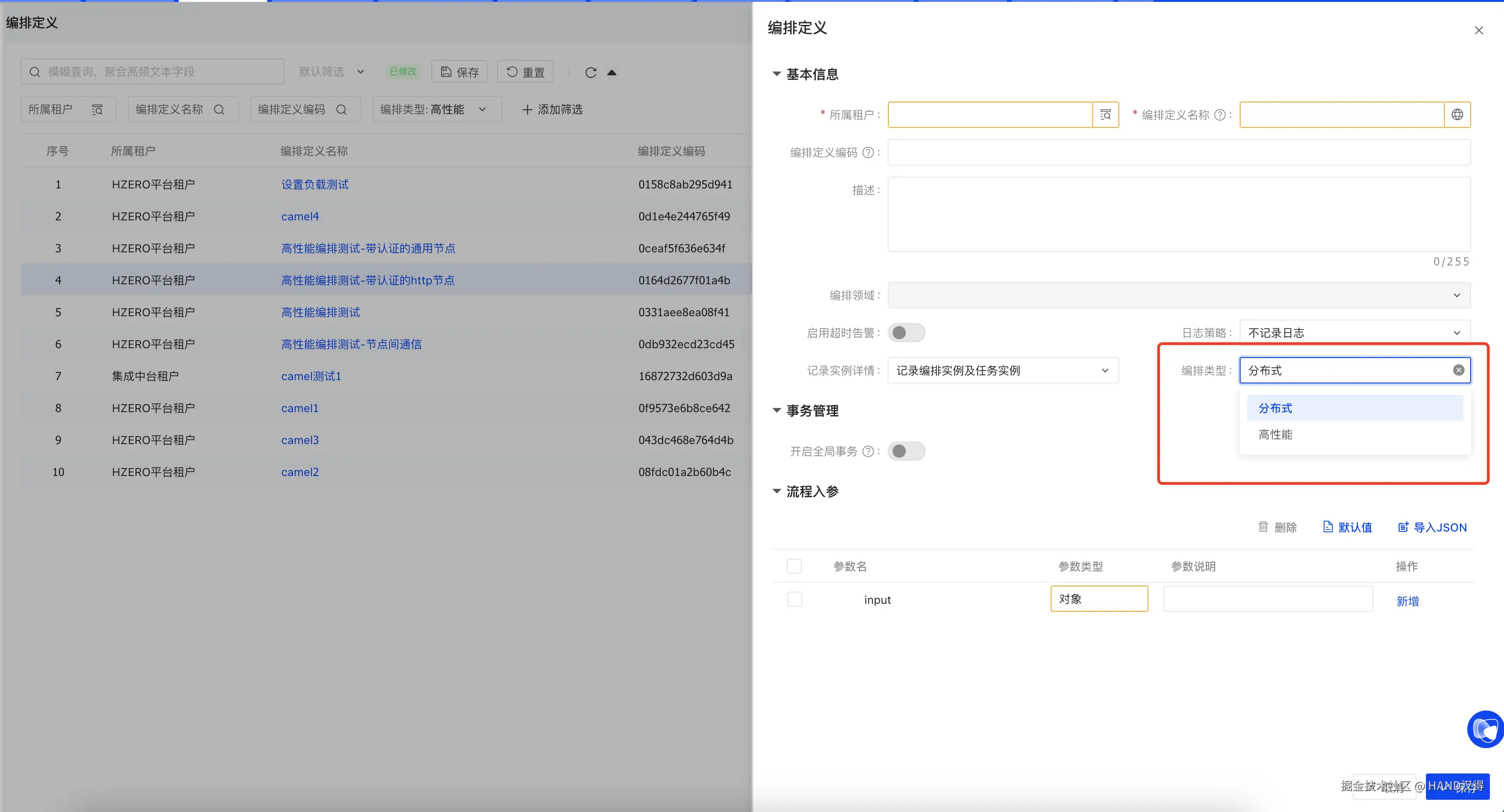 原编排定义功能新增了编排类型,可选值为分布式和高性能,默认为分布式,即原编排模式,可切换到高性能模式。该模式适用于实时数据集成场景,若对实时调用的要求不高,使用现有的分布式编排类型即可。