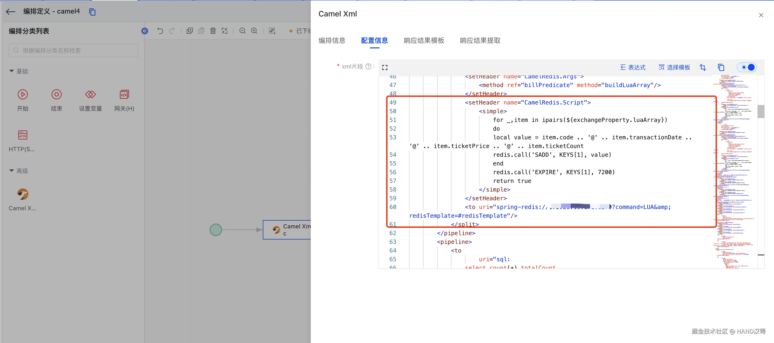 由于高性能编排主要服务于实时调用,随着流程的复杂度提高,其性能是随之下降的,通常只提供有限常用节点。但是考虑到要满足不同用户的需求,集星獭高性能编排提供了Camel Xml节点,基于Apache Camel架构,内置了300多种组件,根据自身需求配置对应的Xml路由即可。