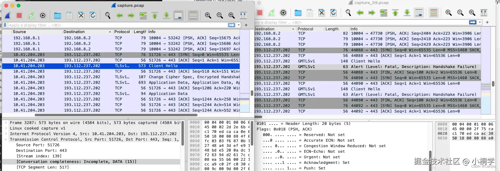 通过正常调用和握手失败的两个网络包对比分析,截图如下: