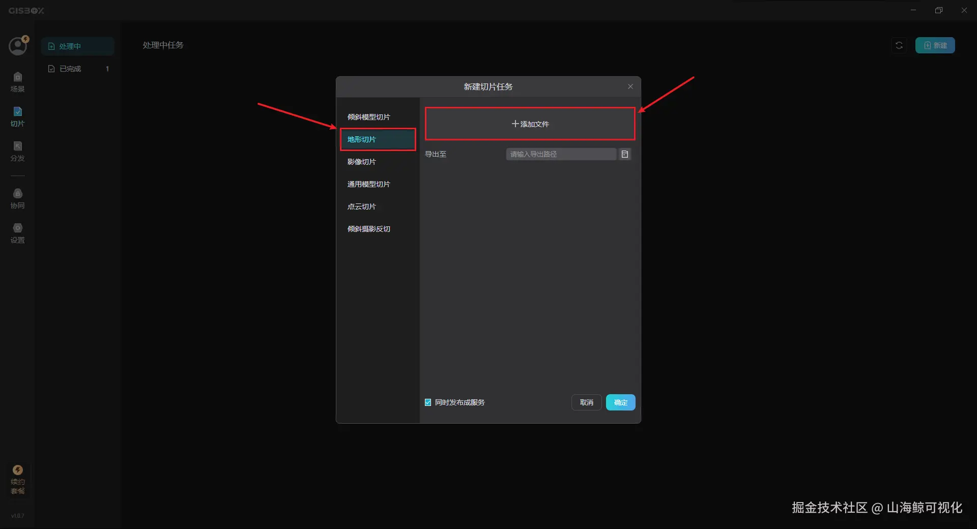 2. 点击左侧切换到 “地形切片” ,然后点击上方的 “+ 添加文件” 按钮添加我们本地的文件,最后点击 “确定” 即可开始切片。