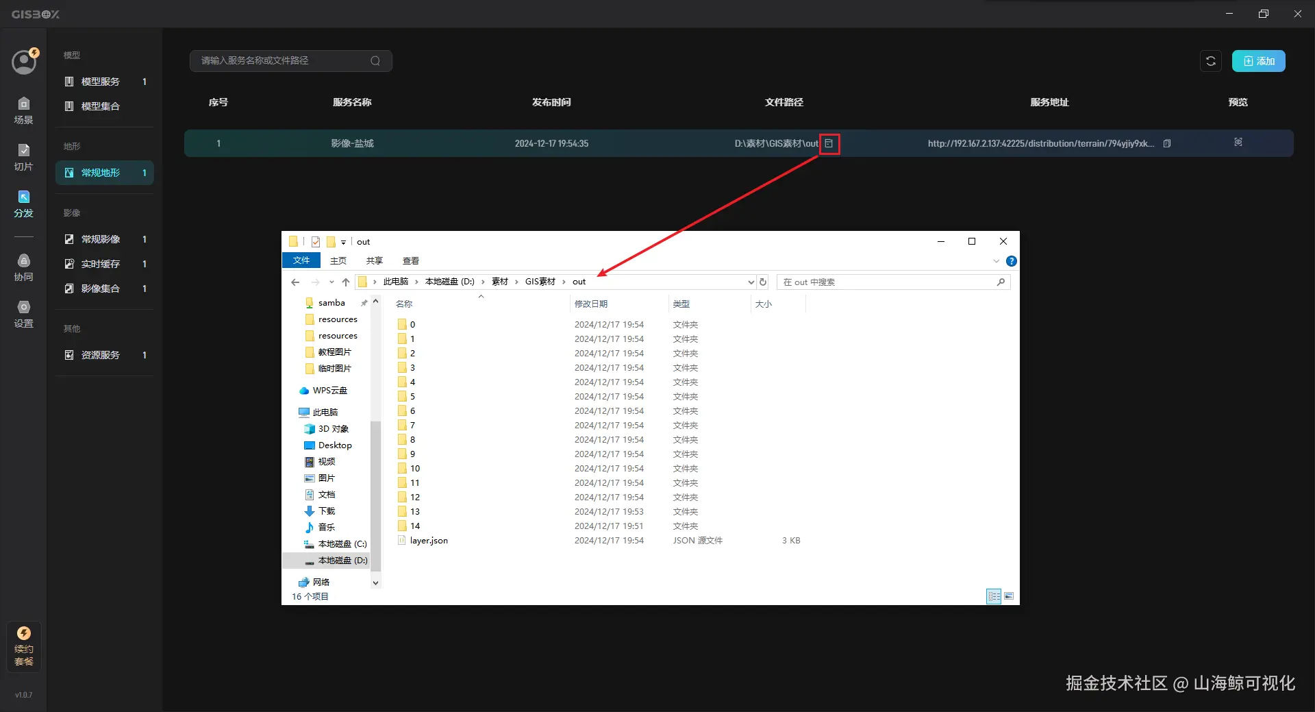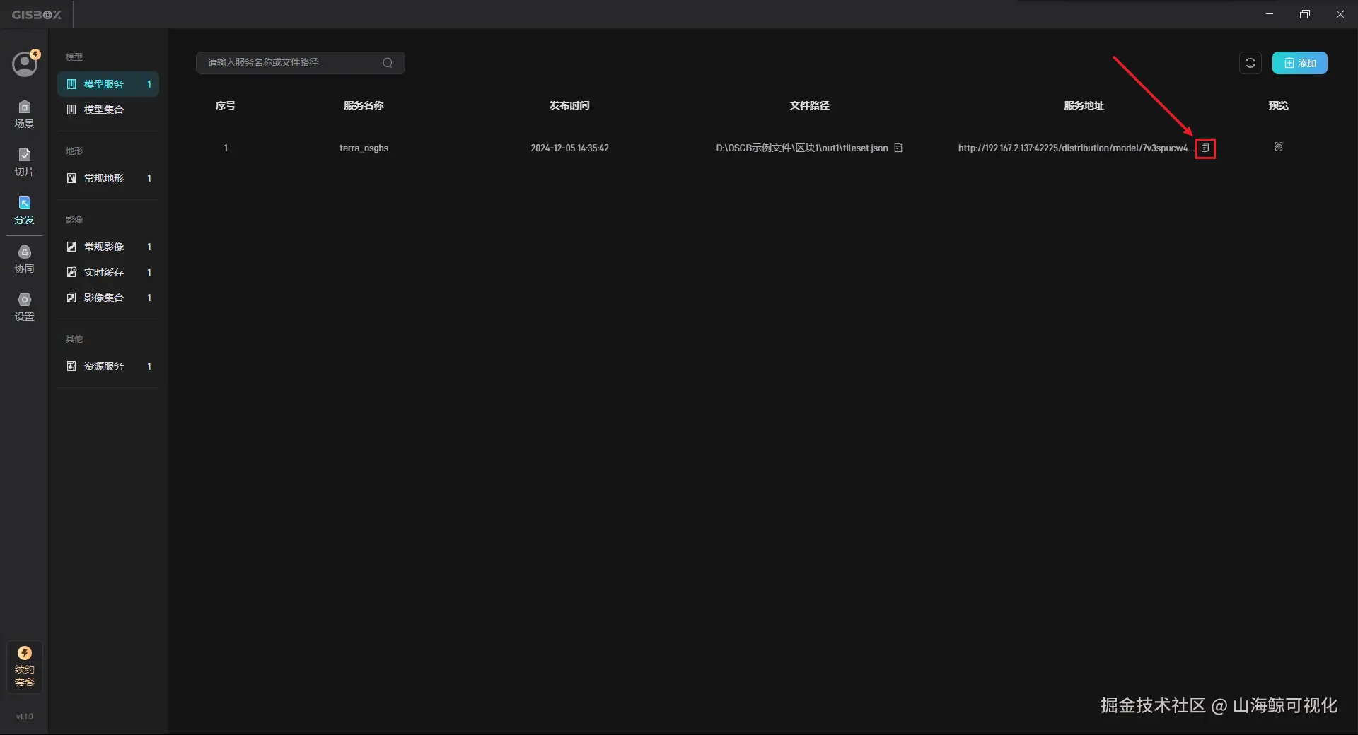 - 切片完成后,点击左侧 “分发” 按钮,可以看到切片完成后自动发布的服务。