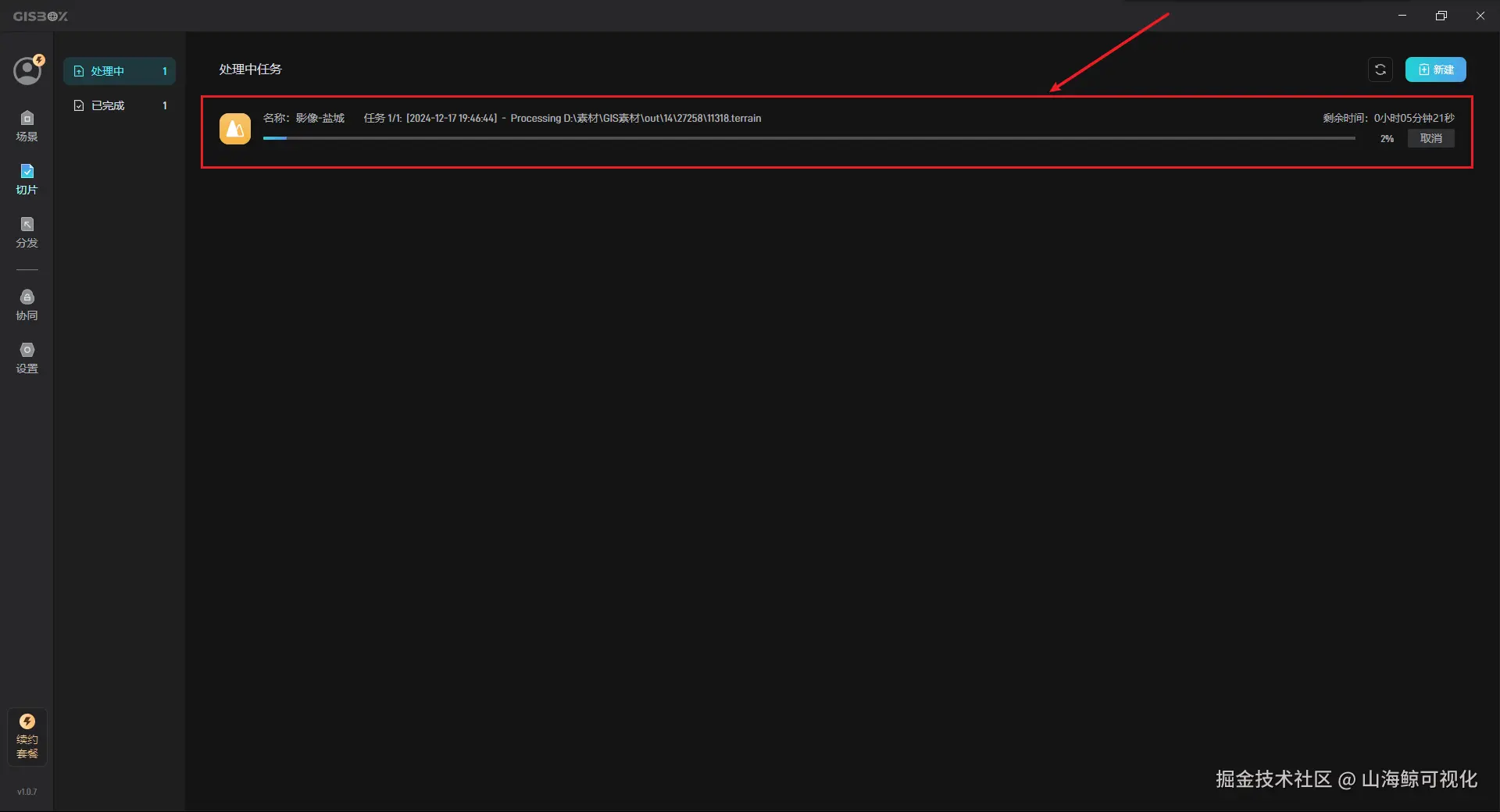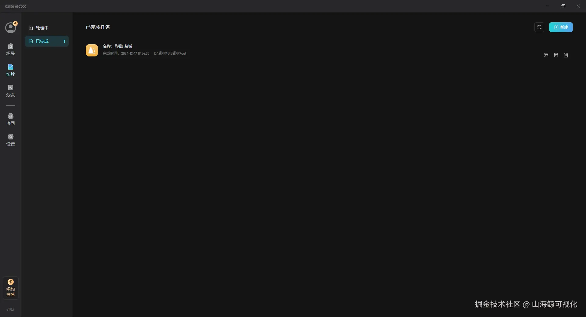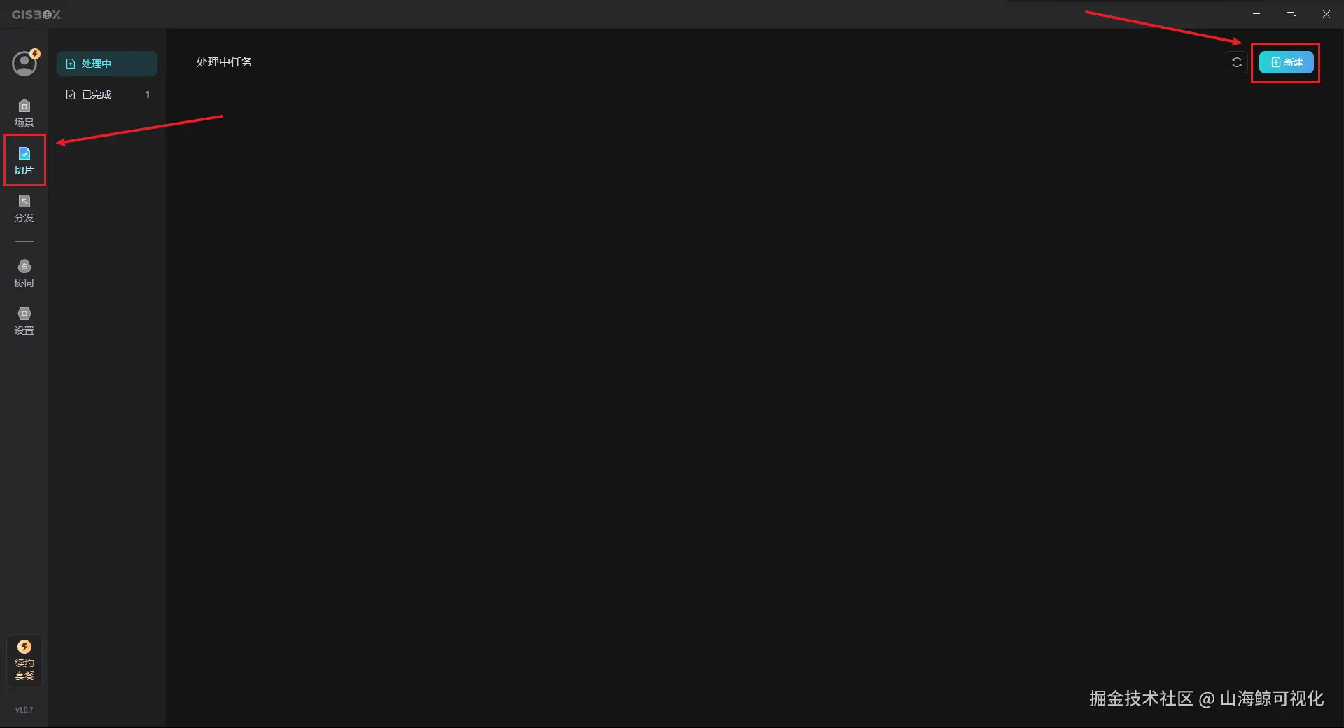 1. 打开GISBox软件,点击左侧切换到 “切片” 功能,然后点击右上方的 “新建” 按钮创建一个切片任务。