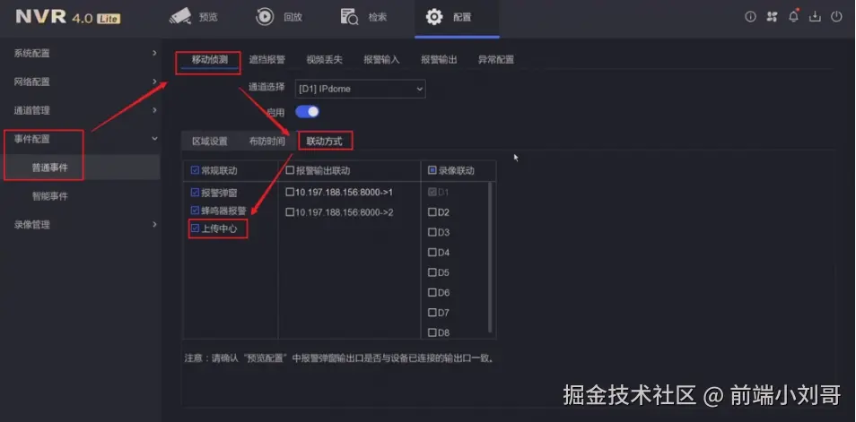 点击“联动方式”,选择“常规联动”,打勾“上传中心”,点击“应用”。即可完成该通道移动侦测推送录像机本地配置,其他通道依次按此步骤操作即可。