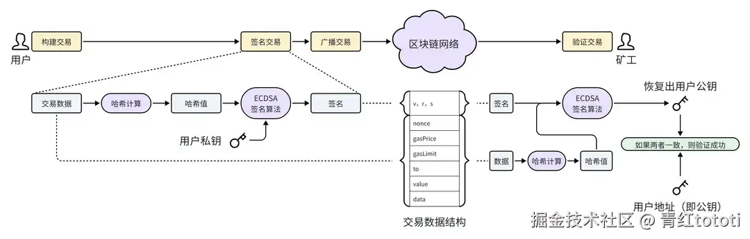 - 用户签名交易,用户将交易数据准备好,计算出交易数据的哈希值,使用椭圆曲线签名算法(ECDSA)对哈希值进行签名,将签名值(v,r,s)附加到交易数据中广播