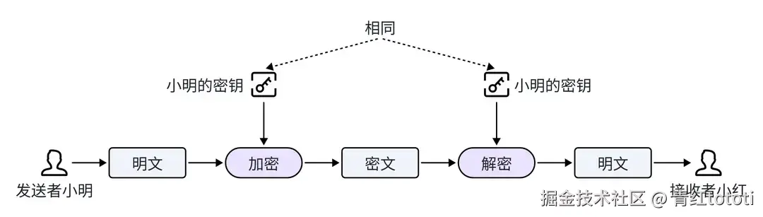 加密和解密使用相同的密钥。意味着发送方和接收方共享这个秘钥