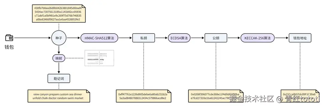 - 生成钱包地址,使用 Keccak-256 哈希函数计算公钥的哈希值,取哈希值最后的20个字节,就是钱包地址