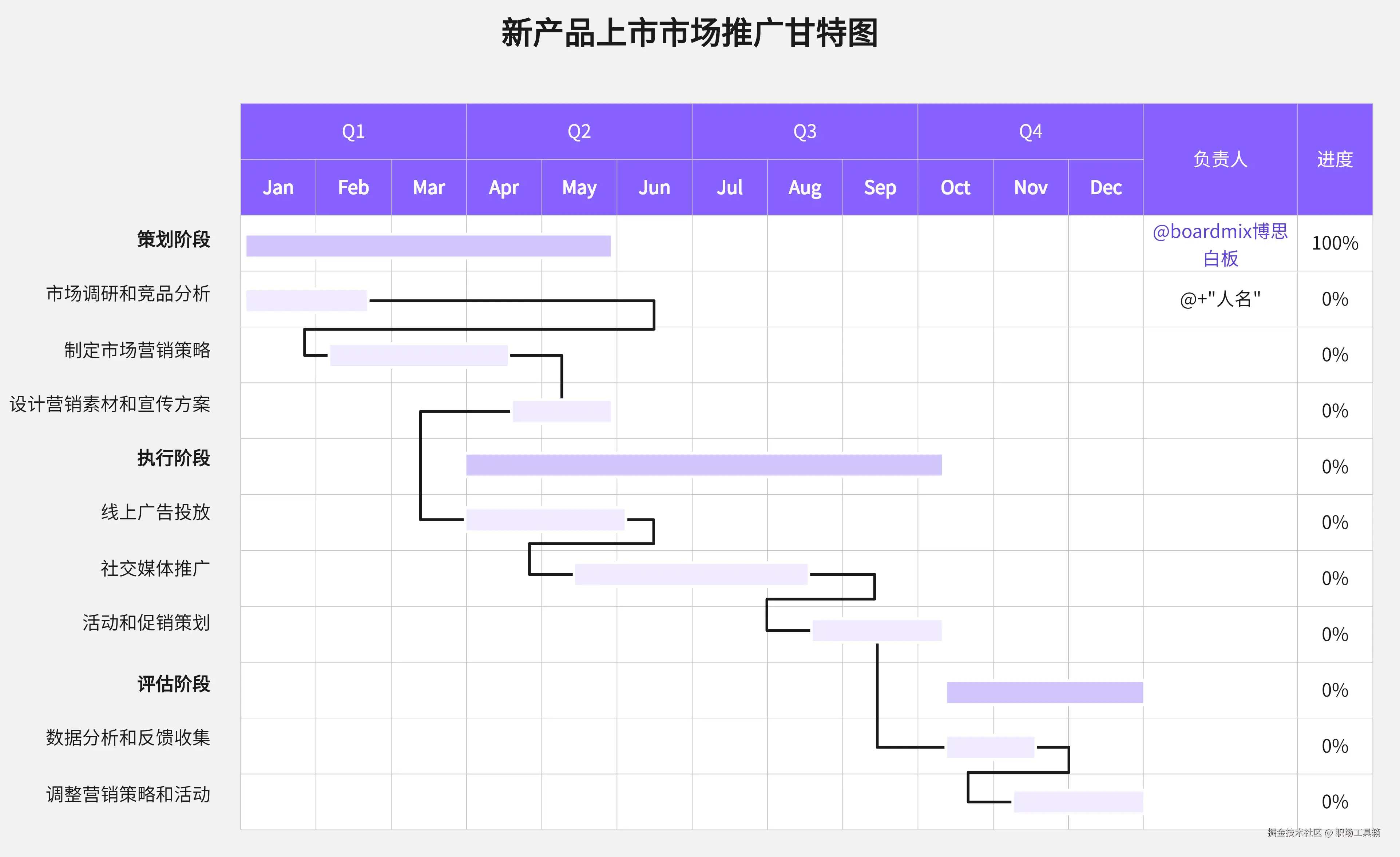 新产品上市市场推广甘特图模板为新产品的市场推广活动提供了一个清晰的项目计划。通过甘特图,项目组可以清晰地了解整个项目的时间安排和进度计划,帮助团队成员更好地协调合作,提高工作效率。