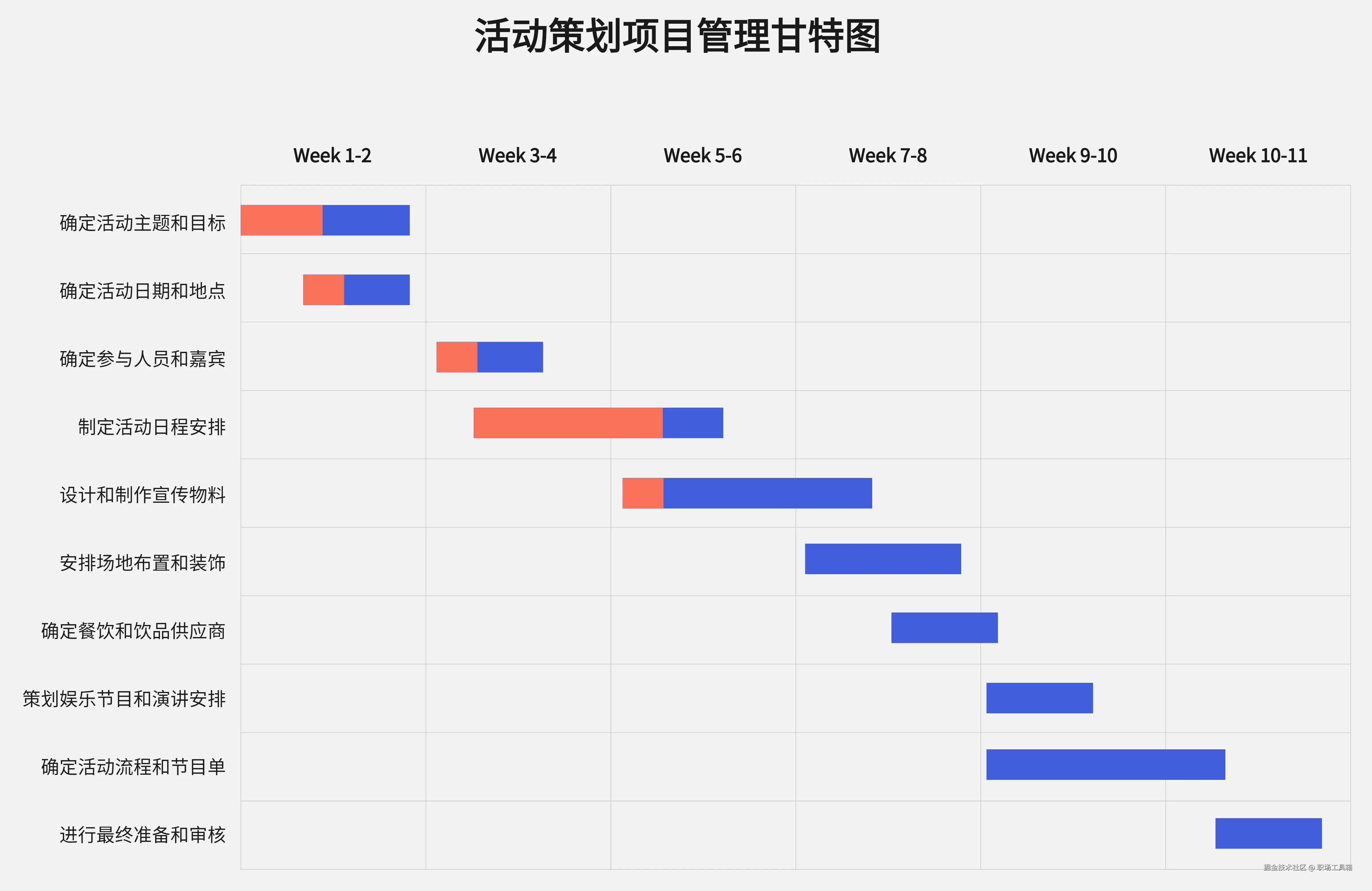 活动策划项目管理甘特图模板是一种项目管理工具,用于可视化项目的计划、进度和里程碑。它展示了项目中各项任务的开始时间、持续时间和完成时间,帮助团队成员清晰地看到项目中各项任务的起止时间,以及它们之间的依赖关系,从而更好地了解项目的进度情况。