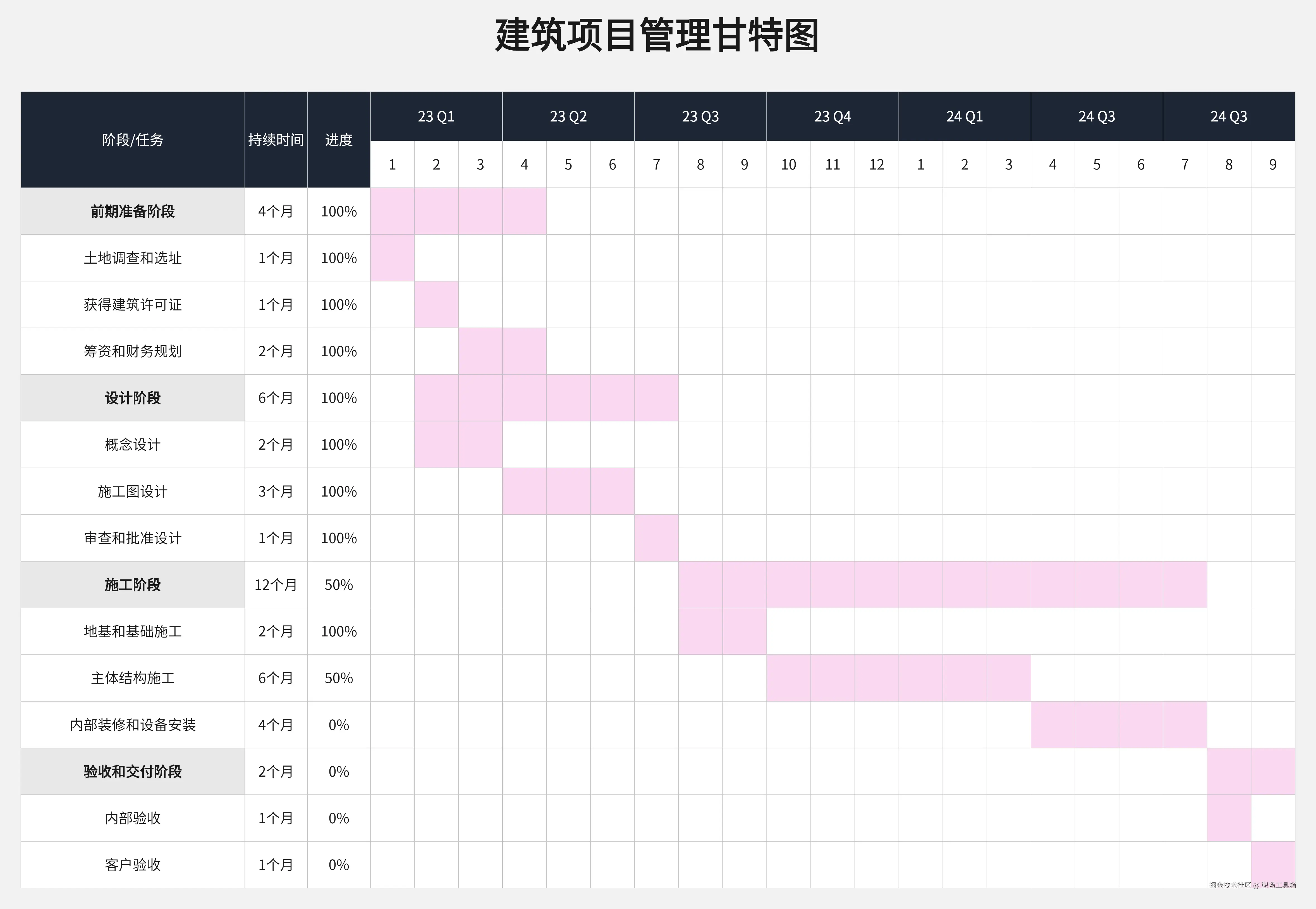 建筑项目管理甘特图模板是一种非常重要的工具,可以帮助项目团队有效地规划、安排和控制项目进度。它以时间为轴,清晰地展示了项目各个任务的开始时间、结束时间以及持续时间,让团队成员一目了然地了解整个项目的时间安排。