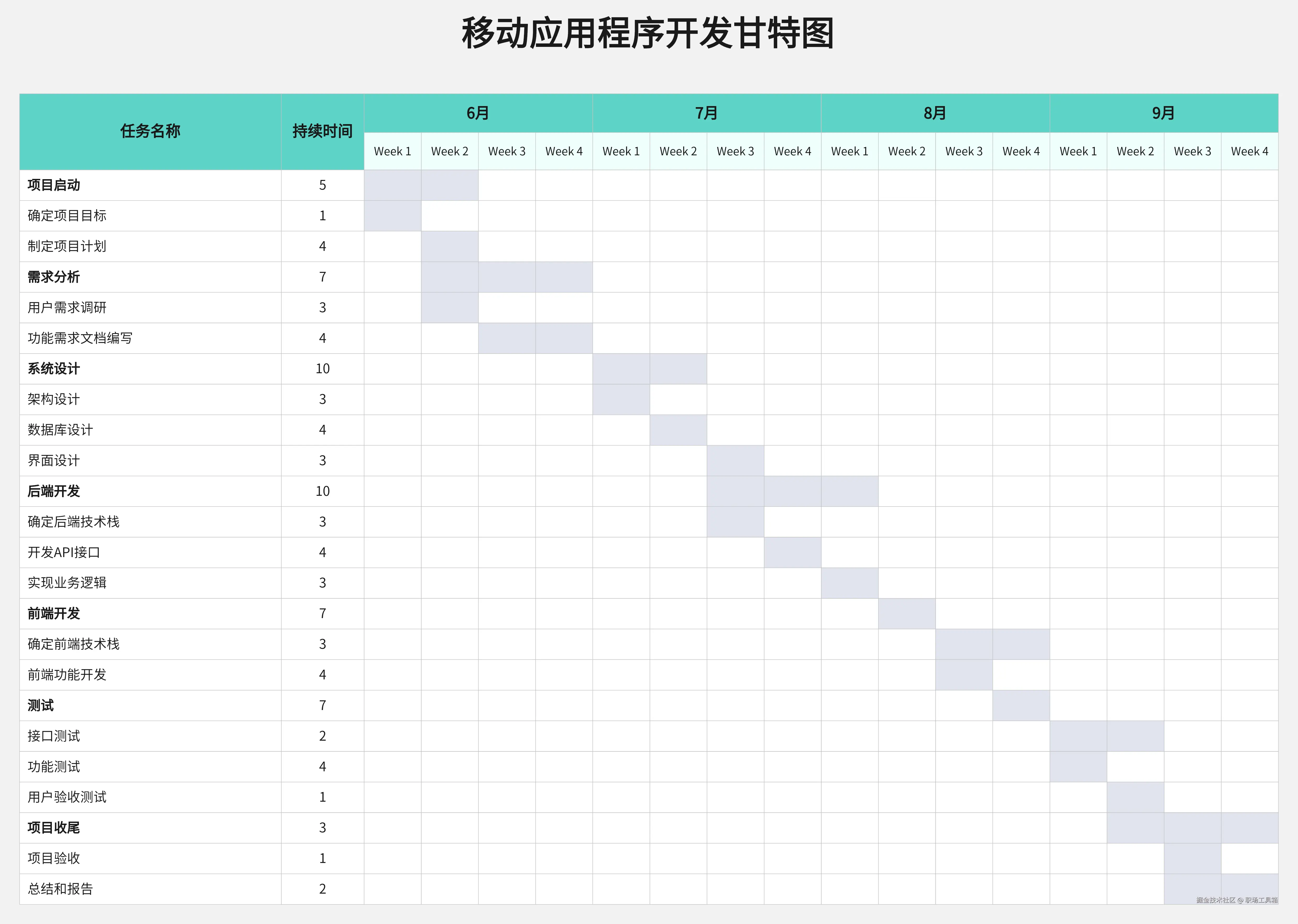 移动应用程序开发甘特图模板为移动应用开发项目提供了一个有效的进度跟踪和任务管理工具。它帮助团队高效地进行进度跟踪和任务管理,清晰地规划项目的时间节点,合理安排开发、测试、上线等各个阶段的工作。