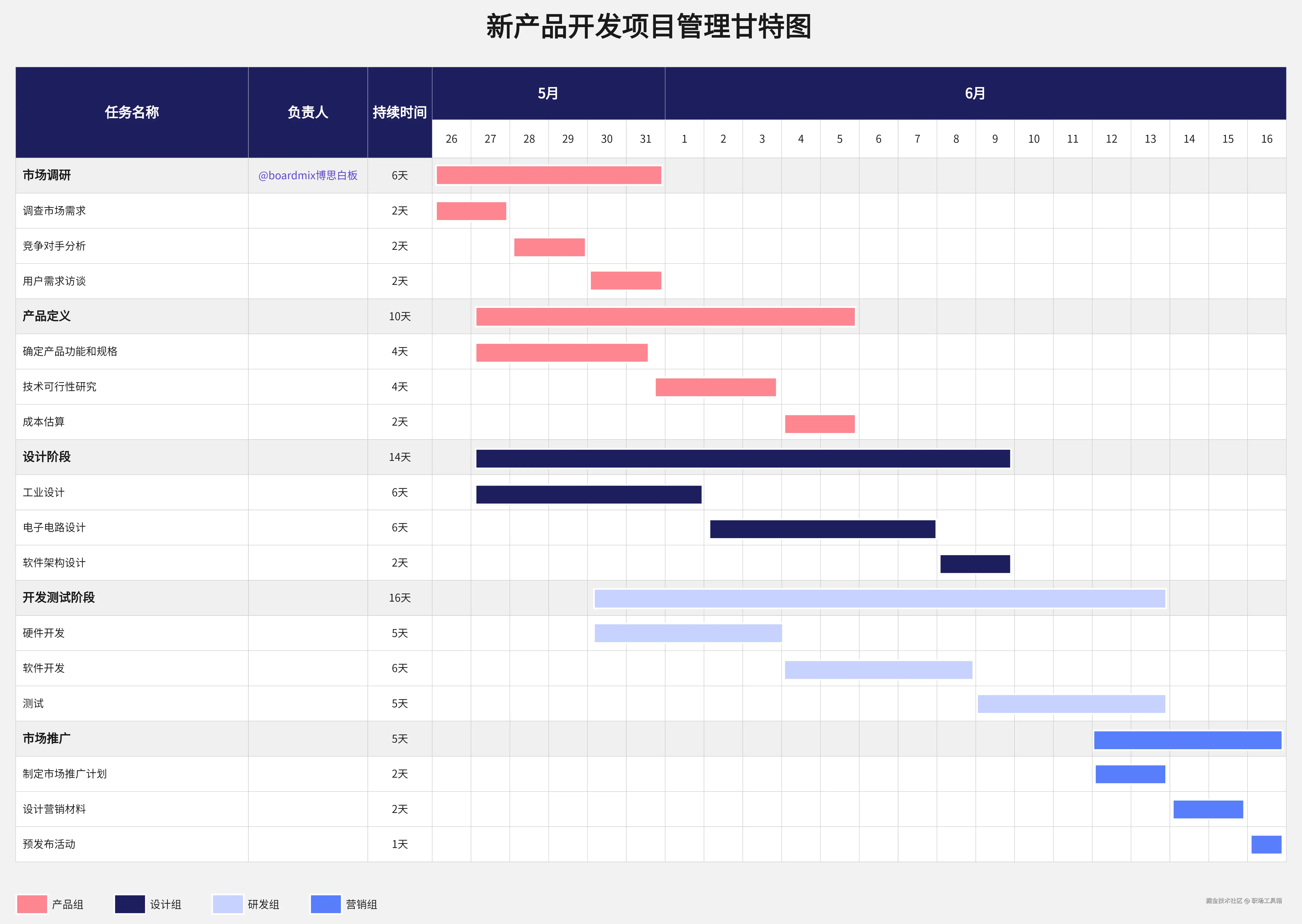 新产品开发项目管理甘特图模板是企业推出新产品所必经的重要环节的项目管理工具。它以时间为基准的进度计划图,通过条形图的方式展示任务的开始时间、持续时间和完成时间,帮助团队成员了解项目进度、分工和优先级,从而更好地协调工作,减少沟通和管理成本。