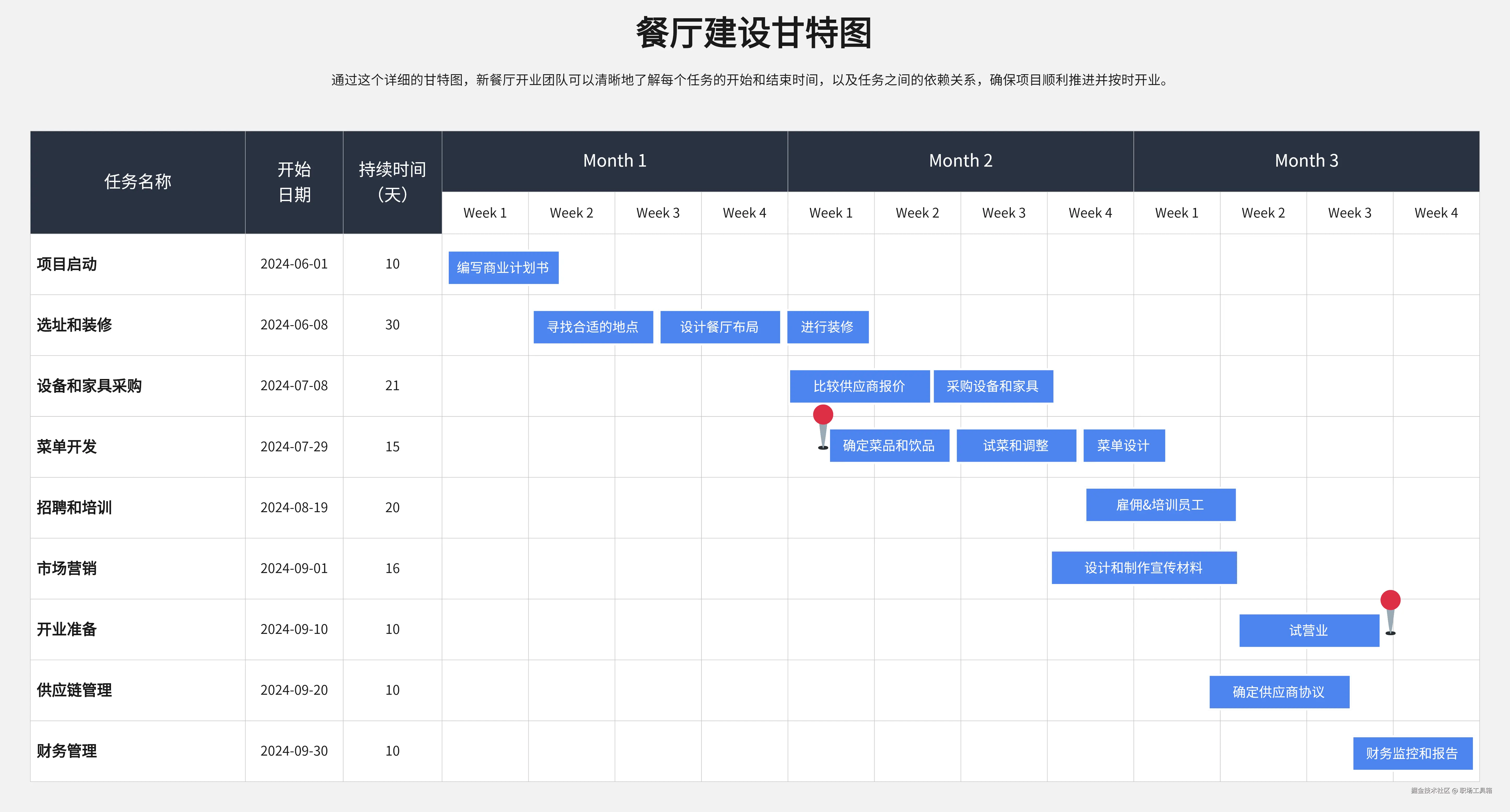 餐厅建设甘特图模板为餐饮行业的建设规划提供了一个重要的项目管理工具。通过合理利用甘特图,可以帮助餐厅管理者高效地组织和安排各项工作,提升施工效率、降低成本、提高规划的精确性,确保餐厅建设顺利进行。