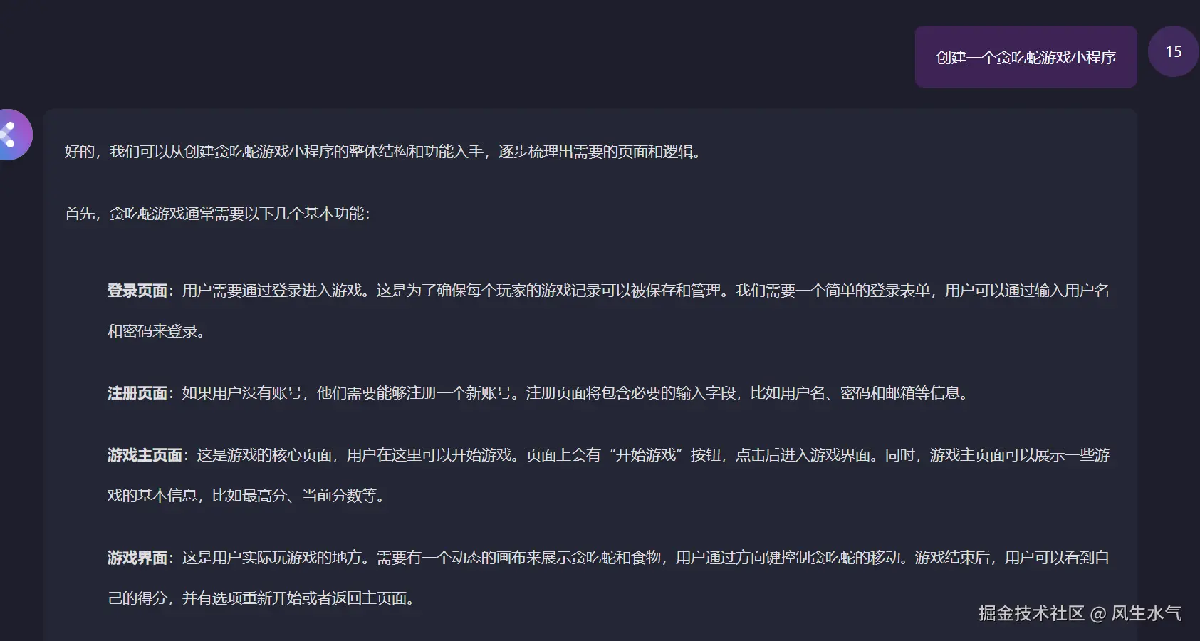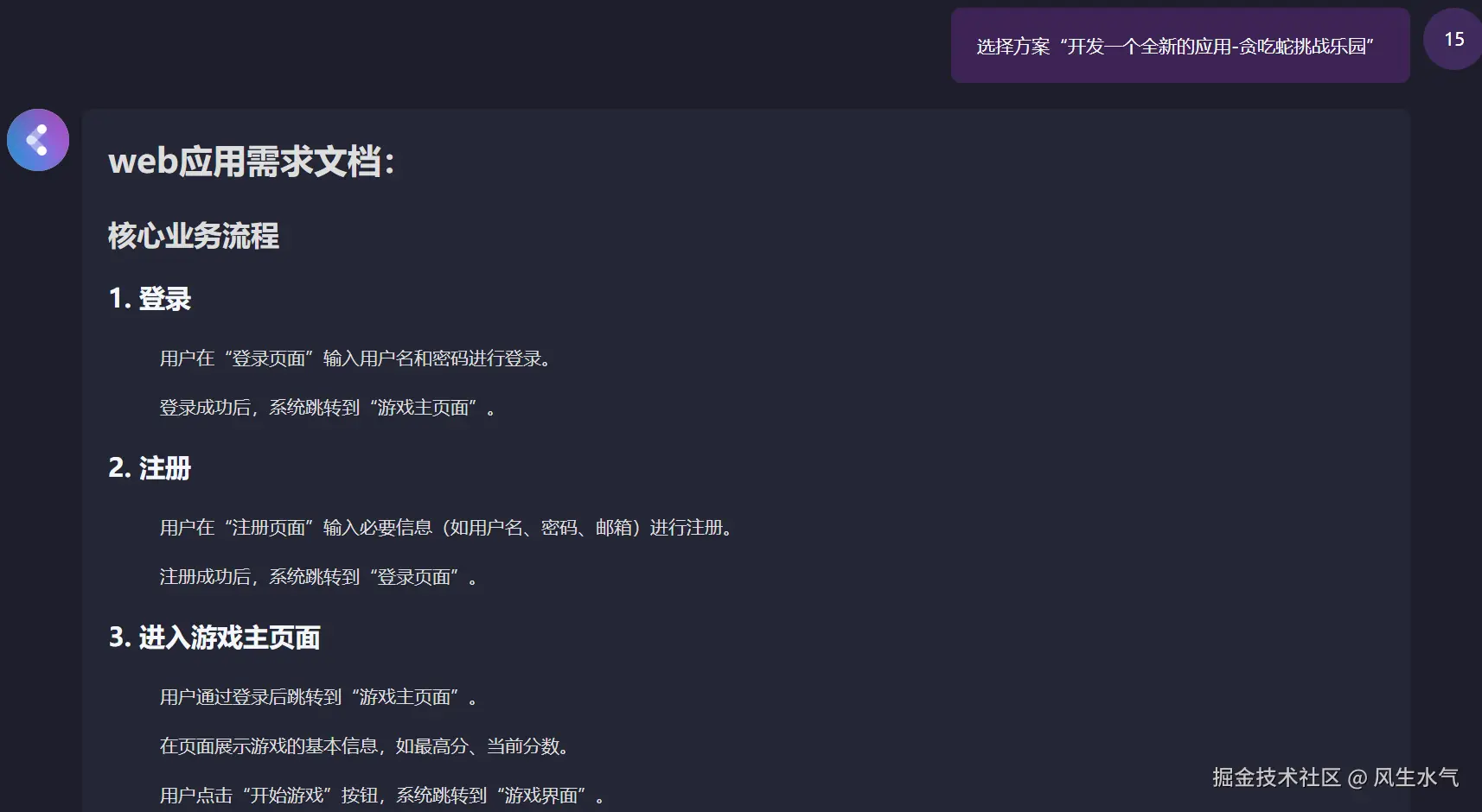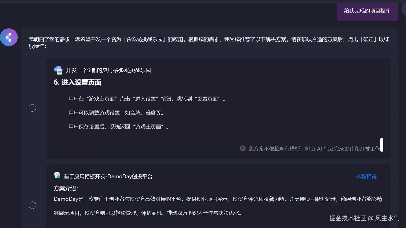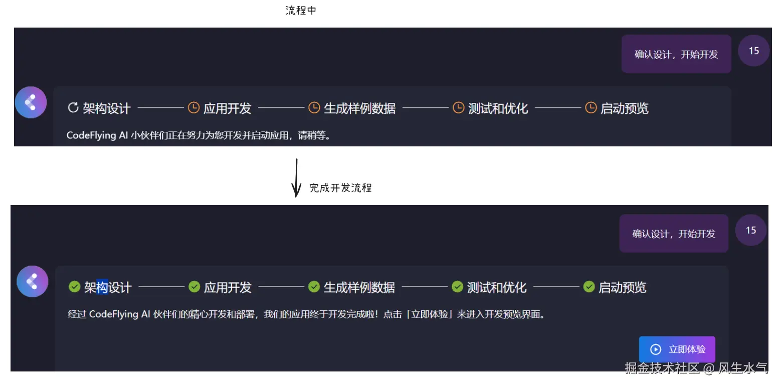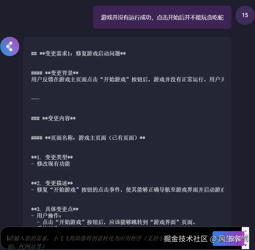 区别于之前工具不考虑中间过程直接给出答案,在codeflying中,当我们要求生成某个项目的时候,它会首先尝试进行架构梳理,根据用户的输入首先提炼出一些功能性需求,并呈现给用户进行确认。