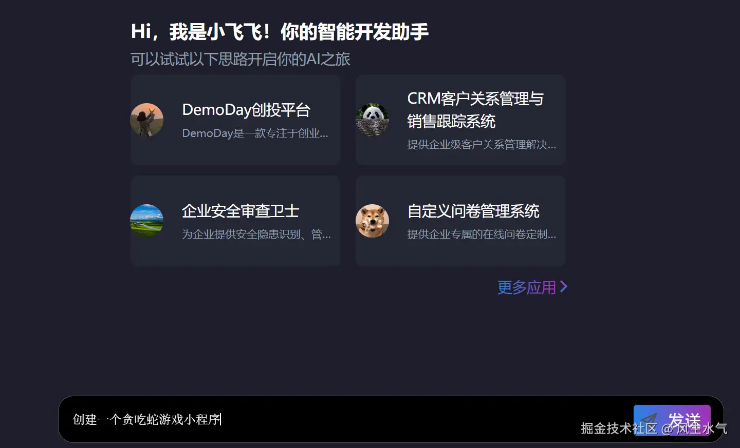 和之前介绍的低代码平台一样,首页最明显的地方就是一个输入框,用来输入你的需求,可以简单描述,也可以详细的描述。