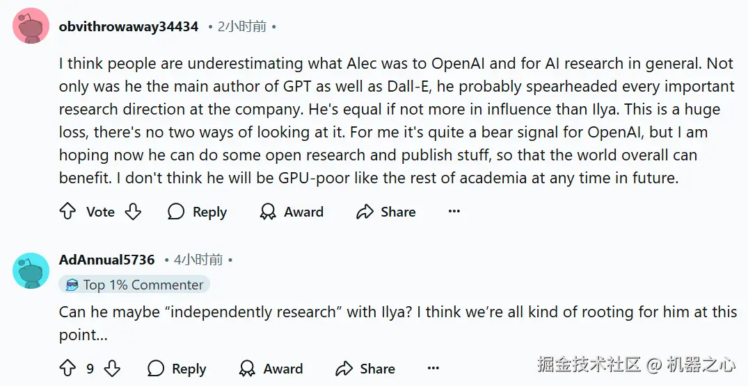 还有人表示人们低估了 Alec 对 OpenAI 以及整个 AI 研究的影响。他不仅是 GPT 和 Dall-E 的主要作者,而且很可能引领了公司所有重要的研究方向。甚至表示他的影响力不亚于 Ilya。这对 OpenAI 来说是一个巨大的损失,但该网友同时也希望 Alec 可以做一些开放的研究并发表一些东西,这样整个世界都可以受益。