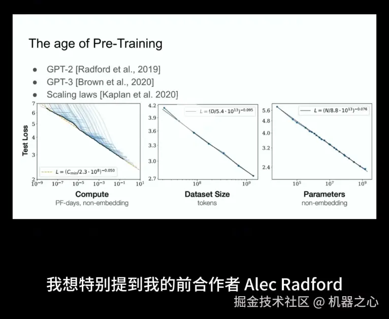 在前几天火热进行的 NeurIPS 2024 大会上,OpenAI 前首席科学家 Ilya Sutskever 在他的演讲中特别提到了 Alec Radford、 Dario Amodei 等人参与的 GPT-2、GPT-3 开创性工作,它们推动了预训练时代以及所有进步的到来。