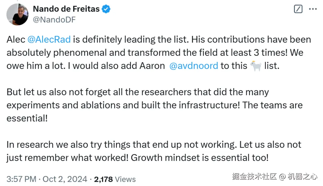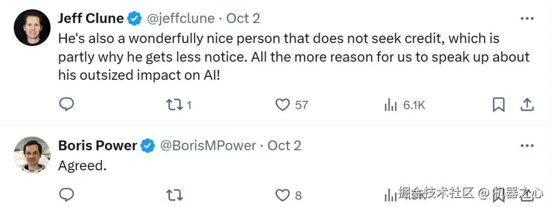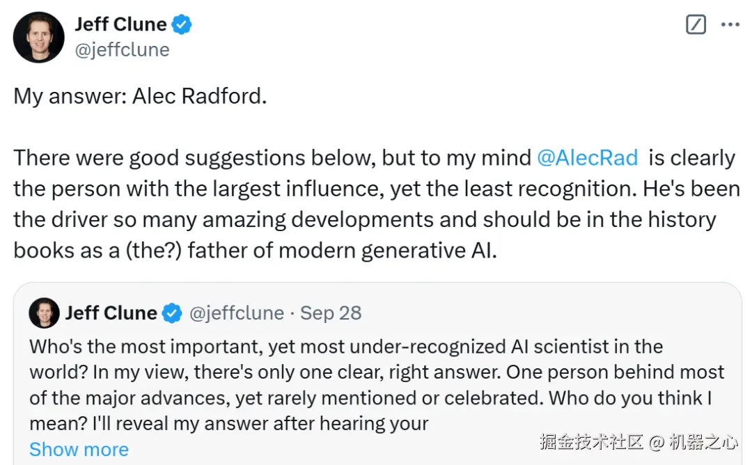 此前,不列颠哥伦比亚大学教授 Jeff Clune 在 X 上发起了一个讨论,「谁是世界上最重要但又最被低估的 AI 科学家?在我看来,只有一个明确的正确答案。大多数重大进展背后都有一个人,但却很少被提及或庆祝。」