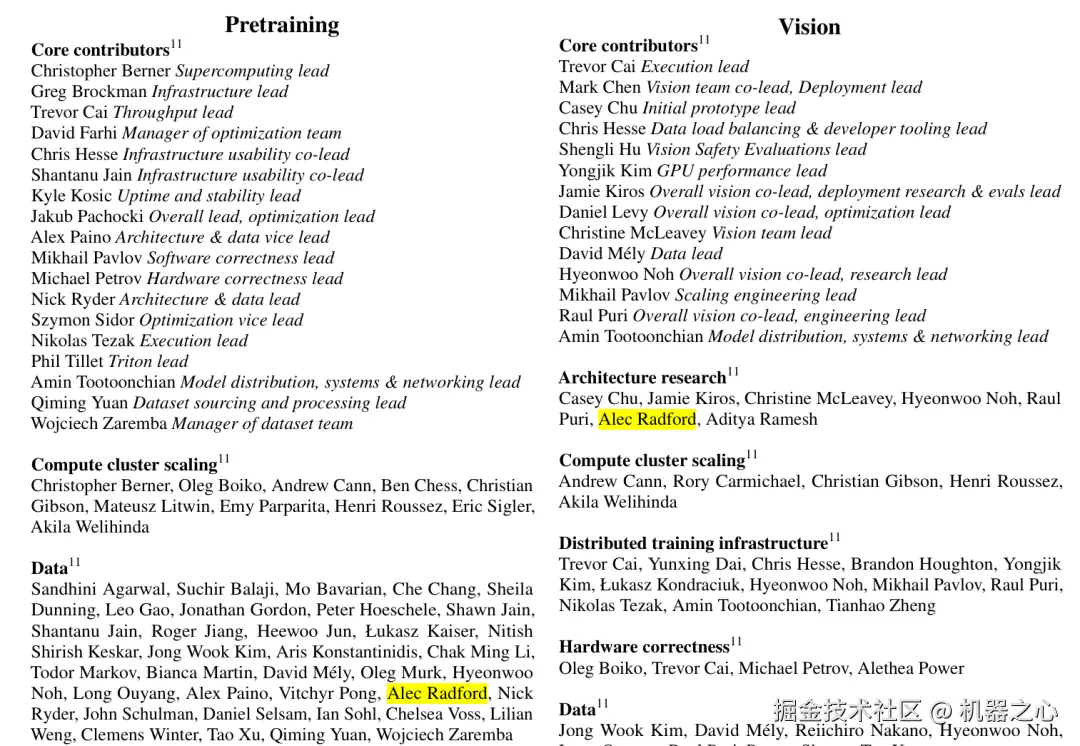 不仅如此,Alec Radford 还参与了 GPT-3 论文的撰写、以及 GPT-4 的预训练数据和架构研究工作。