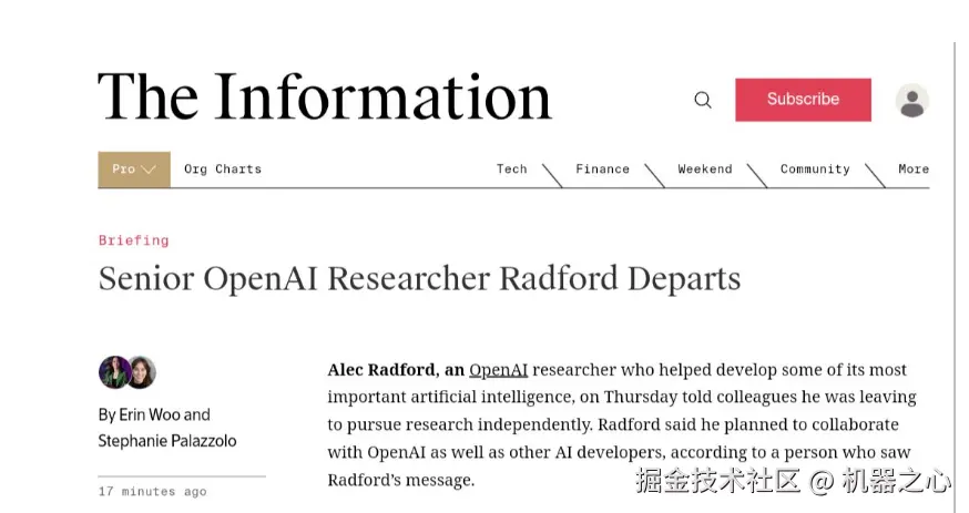 今日,据外媒 The Information 报道,OpenAI 元老级人物 Alec Radford 即将离职,离职后进行独立研究。