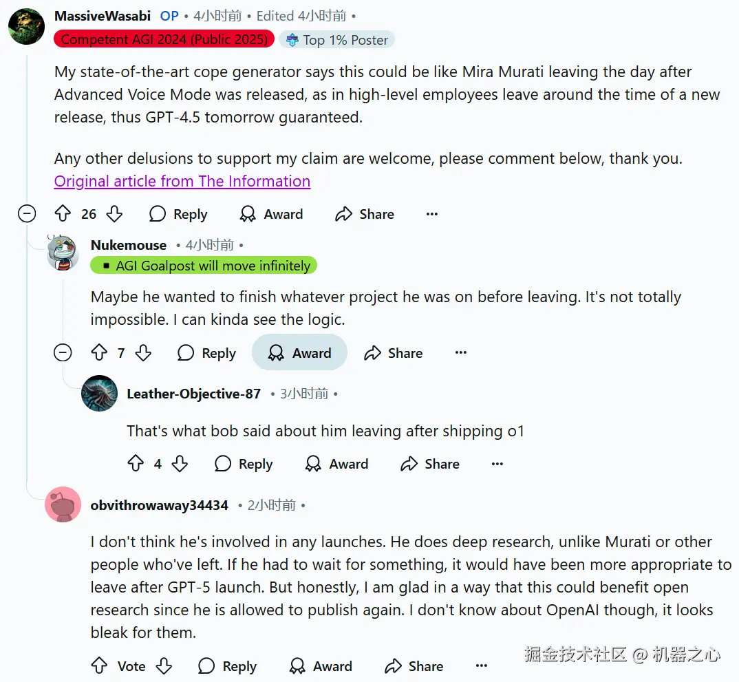 在这条评论下,有人回答道「他虽然做了深入研究,但没有参与任何发布(没有走到台前,一直在幕后),不像 Murati 或其他已经离开的人。如果他不得不等待某件事,那么在 GPT-5 发布后离开会更合适。但老实说,他的离职在某种程度上可能有益于开源研究,因为离开 OpenAI 后会被允许再次发表文章。不过我不知道 OpenAI 的情况,对他们来说,前景看起来很暗淡。」