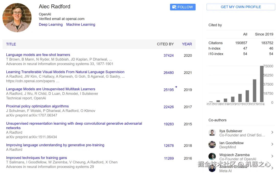 Alec Radford 是 GPT-1 的一作、GPT-2 的共同一作,其中 GPT-1 的被引数已经达到了 11947,GPT-2 的被引数为 14828。