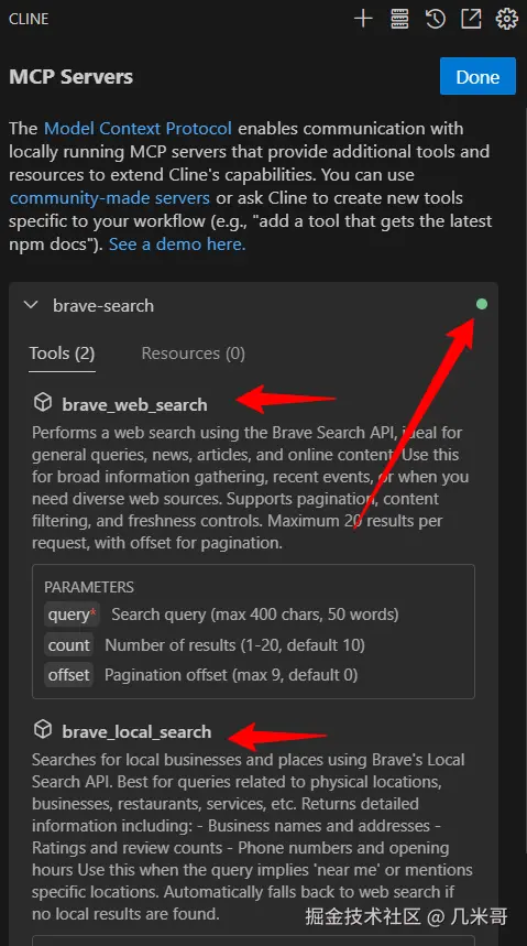 如下图所示,在Cline的MCP设置中,检查MCP服务器的连接状态是否为绿色,确保Brave Search服务器已成功连接。如果没连接,可能要重启一下VSCode。如果连接成功,可以看到列出的Brave Search工具。