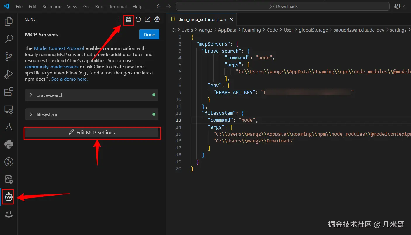 当然,args中的路径需要根据你电脑上的实际路径进行修改,也别忘了把Brave API Key替换为你的API Key。
