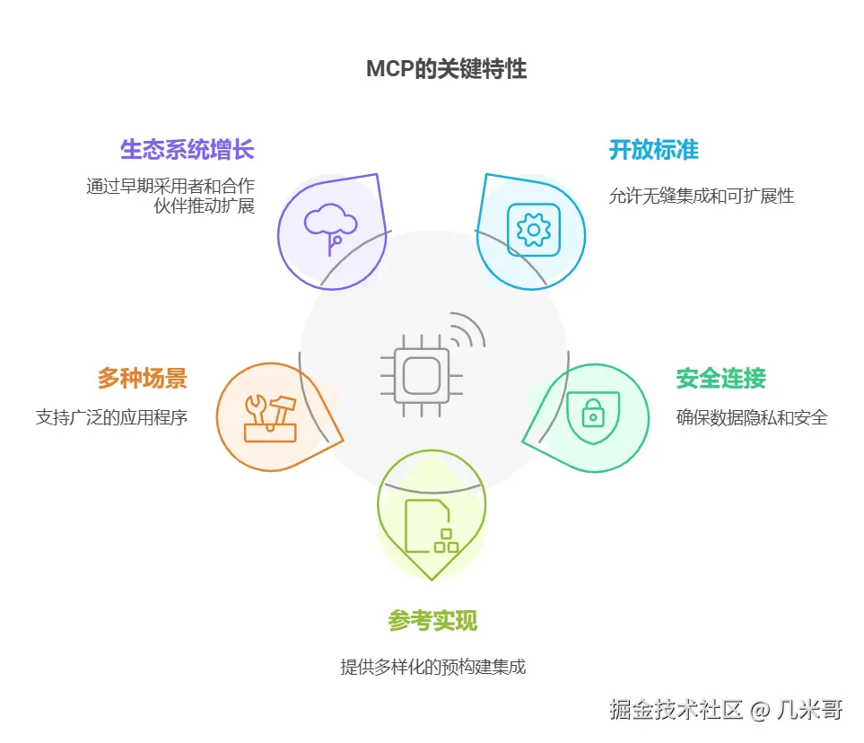 MCP技术的设计目标是通过一个通用开放协议,简化AI系统与数据源之间的连接。如上图所示,以下是其主要特点: