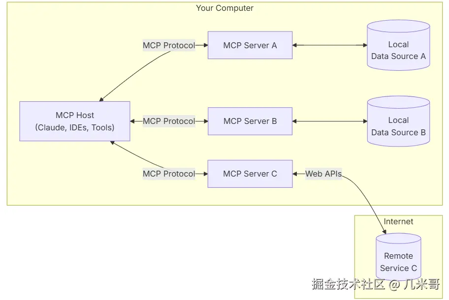 如上图所示,MCP基于客户端-服务器架构,通过以下几个核心组件实现AI助手与数据源的集成: