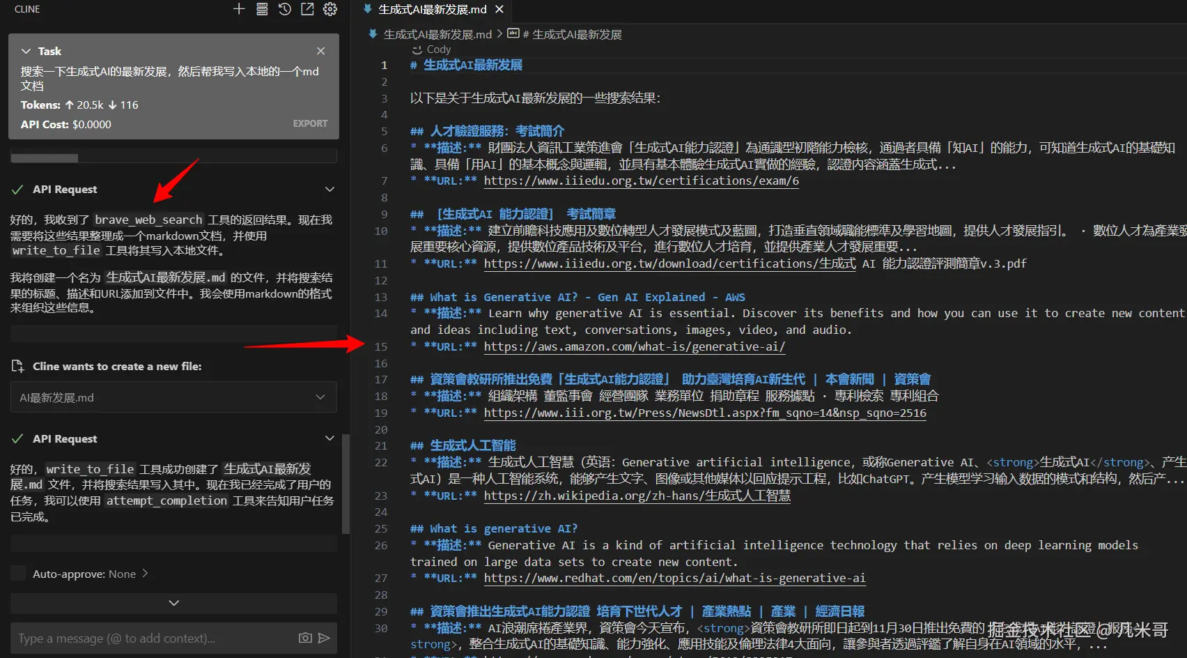如下图所示,Cline成功使用了brave_web_search工具,然后使用Gemini 2.0 Flash模型实验版对结果进行了总结,并帮我写入本地的一个md文档。是不是很赞!