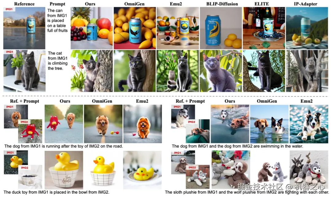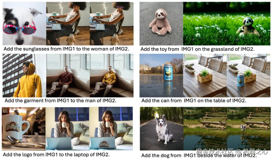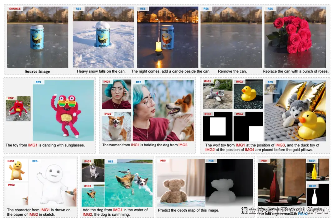 我们重点展示了图像生成与编辑中最具挑战性的三个任务的效果:图像定制化生成、指令编辑和物体插入。